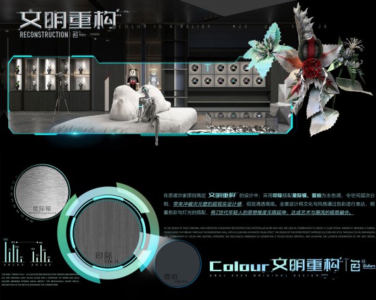 在思諾爾家原創(chuàng)高定文明重構(gòu)的設(shè)計中,采用印際搭配星際銀、翡珀為主色調(diào),令空間層次分明,帶來沖破次元壁的超現(xiàn)實(shí)設(shè)計感,視覺清透高級。全案設(shè)計將文化與風(fēng)格通過色彩進(jìn)行表達(dá),側(cè)重色彩與燈光的搭配,將Z世代年輕人的思想維度無限延伸,達(dá)成藝術(shù)與潮流的極致融合。