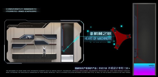 思諾爾家“潮玩·文明重構(gòu)”套系采用機(jī)械紀(jì)元有機(jī)嵌光玻璃與冷暖色調(diào)的對比,帶來極強(qiáng)的視覺沖擊,細(xì)節(jié)處的機(jī)械之心金屬裝飾加強(qiáng)氛圍感。思諾爾家的設(shè)計師在產(chǎn)品研發(fā)中將虛擬現(xiàn)實(shí)、科技、人工智能、全息投影……這些元素融入到設(shè)計中,令作品的思想維度無限延伸,這是文化與風(fēng)格之間的多元碰撞,更是藝術(shù)與潮流的極致融合。