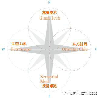 歐洲在北南西東方向的設(shè)計(jì)特質(zhì)在當(dāng)代的最新表現(xiàn)可以分別抽象出高雅技術(shù)、視覺(jué)博覽、生態(tài)主線和東方時(shí)尚等四個(gè)關(guān)鍵詞,見(jiàn)圖1所示。