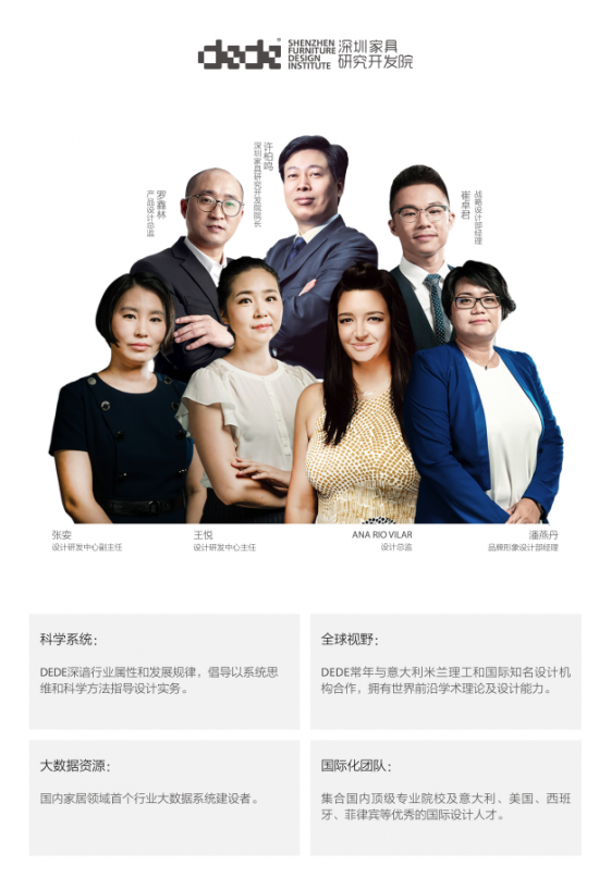 深圳家具研究開發(fā)院(DEDE)成立于2002 年,由國家公派意大利米蘭理工大學訪問學者、南京林業(yè)大學博士生導師許柏鳴教授親自帶隊組建。運營以來,依托自身強大的平臺優(yōu)勢,集合了國內外頂級專業(yè)機構的優(yōu)秀人才和資源,通過對行業(yè)大數(shù)據(jù)的積累以及先進知識體系的創(chuàng)建,成為了國內首屈一指的家具產業(yè)戰(zhàn)略與實務設計機構。DEDE 提供以頂層規(guī)劃為牽引的企業(yè)戰(zhàn)略設計,在此基礎上進行家具產品研發(fā)、品牌形象策劃等系統(tǒng)性的設計服務。近年來,DEDE 致力于在產業(yè)上下游細分領域各打造一個標桿品牌,以此推動中國家具產業(yè)的進步。