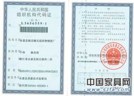 證書介紹 此組織機構(gòu)代碼證是中國貝適嬰兒正姿睡墊在中國境內(nèi)唯一的,始終不變的法定代碼標(biāo)識和憑證。 證書圖片 |