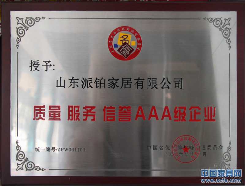 派鉑家居榮獲“質(zhì)量、服務(wù)、信譽AAA”企業(yè)。