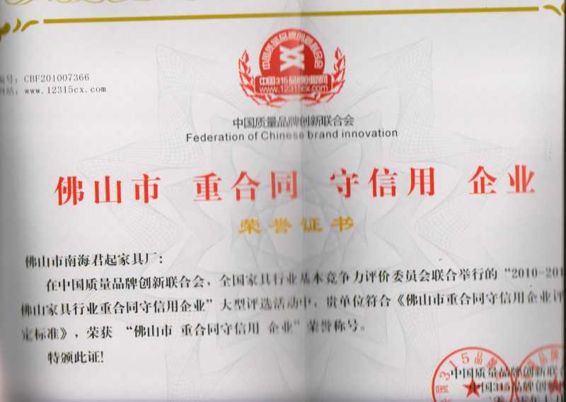經(jīng)有關(guān)部門聯(lián)合核實(shí),佛山市南海君起家具廠長(zhǎng)期以來無違反合同行為,特授予“佛山市重合同 守信用”企業(yè)