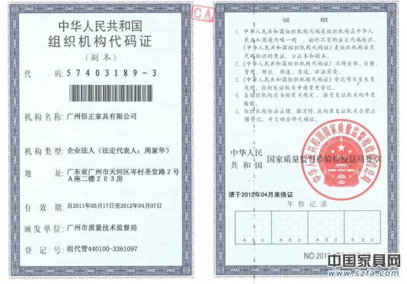 廣州佰正家具有限公司組織機(jī)構(gòu)代碼證副本