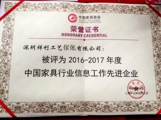 證書介紹 昨日上午(2017年4月10日),由中國家具協(xié)會主辦的“共享新絲路,合作創(chuàng)未來• 2017中國家具產(chǎn)業(yè)發(fā)展(香河)高峰論壇暨2017中國家具行業(yè)信息大會”在河北香河召開。祥利集團(tuán)(深圳祥利工藝傢俬有限公司)應(yīng)邀出席現(xiàn)場,并獲評“2016年——2017年度中國家具行業(yè)信息工作先進(jìn)企業(yè)”。