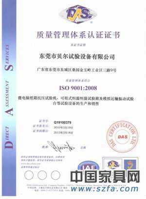 證書介紹 一、貝爾專業(yè)生產(chǎn)、銷售的產(chǎn)品主要有: 電池檢測設(shè)備:電池擠壓試驗機、電池針刺試驗機、電池重物沖擊試驗機、電池短路測試儀、電池燃燒顆粒試驗裝置、電池擠壓針刺一體機、自由跌落試驗機、電磁振動臺等。 環(huán)境檢測設(shè)備:恒定濕熱試驗箱、高低溫交變試驗箱、鹽霧腐蝕試驗箱、冷熱沖擊試驗箱、恒溫恒濕室:紙箱抗壓強度試驗機,模擬汽車運輸振動臺,包裝跌落試驗機,紙板環(huán)壓強度測定儀,紙板邊壓強度測定儀,紙板粘合強度測定儀、紙板耐破度測定儀等。 膠帶、塑膠檢測設(shè)備:膠帶剝離強度試驗機,膠帶持粘力測試儀,膠帶初粘性試驗機,烘箱型膠帶保持力試驗機,塑膠熔融指數(shù)儀等。 力學檢測設(shè)備:紙帶耐摩擦試驗機、酒精耐摩擦試驗機、油墨脫色試驗機、搖擺試驗機、按鍵壽命試驗機等 二、發(fā)展歷史: 貝爾集團成立于1998年,作為儀器設(shè)備領(lǐng)域的高科技公司,創(chuàng)業(yè)多年,集科、工、貿(mào)為一體,在香港設(shè)立貝爾實業(yè)(香港)有限公司,在中國大陸設(shè)立東莞市貝爾試驗設(shè)備有限公司、東莞市環(huán)宇檢測儀器有限公司,并陸續(xù)在全國各大城市建立營銷及售后服務(wù)網(wǎng)絡(luò)。 三、宗旨與導向: 貝爾一貫以“科技保證質(zhì)量,服務(wù)完善產(chǎn)品”為宗旨,以“服務(wù)第一,銷售第二;以誠相待,共進雙贏”為導向,具備完善的4S體系,銷售Sale、零配件Sparepart、售后服務(wù)Service、信息反饋Survey環(huán)環(huán)相扣。貝爾以其廣泛深厚的國際關(guān)系、強大的營銷和售后服務(wù)力量、雄厚的技術(shù)實力,為您提供理想的研究、生產(chǎn)技術(shù)環(huán)境,產(chǎn)品廣泛應(yīng)用于電子、半導體、醫(yī)藥、化工、化妝品、涂料、石油、食品等行業(yè)及高校、檢驗檢疫局、商檢、藥檢、軍科院、中科院等科研機構(gòu)。經(jīng)過多年的經(jīng)驗積累,貝爾能夠為您提供IT、半導體、醫(yī)藥、化工、食品等行業(yè)產(chǎn)品檢測及品質(zhì)管理的整體實驗室解決方案和專業(yè)化服務(wù)。 四、經(jīng)營理念: 今天的誠信,明天的市場,后天的利潤。貝爾以客戶為尊,以質(zhì)量為本,為目標市場提供一流的服務(wù),使客戶得到最大的增值效益,與客戶建立長久、互信、雙贏的合作伙伴關(guān)系。 五、服務(wù)理念: 快捷、高效的服務(wù)為客戶徹底解除后顧之憂。多年來,貝爾在做好自身產(chǎn)品及代理產(chǎn)品的售后及維修工作外,為滿足客戶的要求,不斷地為客戶解決其它進口品牌儀器的維修難題,在客戶中樹立了良好的形象。 六、產(chǎn)品應(yīng)用領(lǐng)域: 產(chǎn)品廣泛用于科研﹑航空﹑軍事﹑電子﹑電工﹑玩具、紙品、五金、電池、郵電通信等各種行業(yè)。公司依托自身的人才、技術(shù)、資金優(yōu)勢,為科研、電工、電子、軍事、航空、船舶、郵電通信、汽車、摩托車等企事業(yè)單位提供符合GB、GJB、IEC、MIL、DIN等標準的各類環(huán)境試驗設(shè)備和力學試驗設(shè)備 。 優(yōu)級的服務(wù) :免費包裝送貨,免費保修一年,終身服務(wù)并提供配件及易損件 證書圖片 |