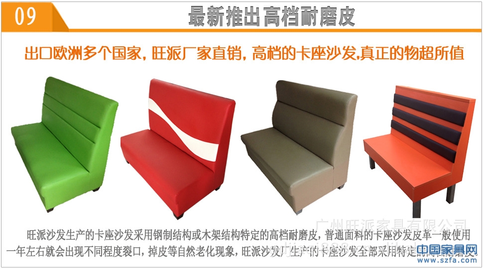 1、最新推出高檔耐磨皮:旺派沙發(fā)生產的卡座沙發(fā)采用鋼制結構或木制結構特定的高檔耐磨皮,普通面料的皮革卡座沙發(fā)皮革一般使用一年左右就會出現不同程度裂口,掉皮等自然老化現象,旺派沙發(fā)廠生產的卡座沙發(fā)全部采用特定的高檔耐磨皮,經驗證:用鎖匙刮過后都不會出現裂口,刮痕,如果您有需要我們可以免費為您寄過皮樣色卡,您收到皮樣后您可以同普通皮革作對比(郵寄費由買方支付)