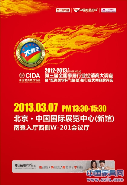 2013年3月7日下午13:30-15:30,2012-2013’第三屆全國家居行業(yè)經(jīng)銷商大調(diào)查暨“紙尚美學(xué)”杯墻(壁)紙行業(yè)優(yōu)秀品牌評選頒獎典禮在北京·中國國際展覽中心(新館)W201會議廳隆重舉行,500余名墻紙經(jīng)銷商及廠家代表參加盛會,中國室內(nèi)裝飾協(xié)會領(lǐng)導(dǎo)、房地產(chǎn)業(yè)協(xié)會領(lǐng)導(dǎo)出席典禮并為獲獎品牌頒獎。