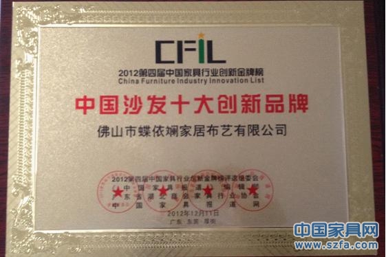 2012年12月11日,由《中國家具報道》發(fā)起,攜手《中國家具報道網(wǎng)》、《中國家具論壇網(wǎng)》聯(lián)合主辦的2012第四屆中國家具行業(yè)創(chuàng)新高峰論壇暨創(chuàng)新金牌榜頒獎典禮在東莞盛大舉行,來自全國家具行業(yè)的數(shù)百精英聚集一起共商家具業(yè)創(chuàng)新發(fā)展之策,廣東蝶依斕沙發(fā)繼2009年、2011年被評為中國沙發(fā)十大創(chuàng)新品牌后再次上榜“中國沙發(fā)十大創(chuàng)新品牌”。