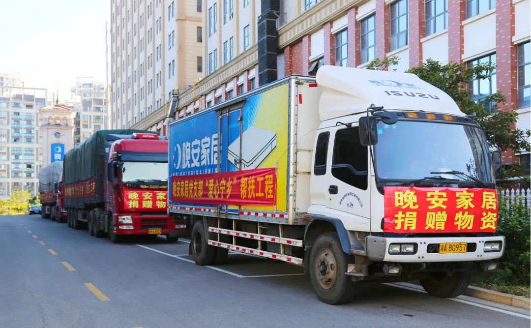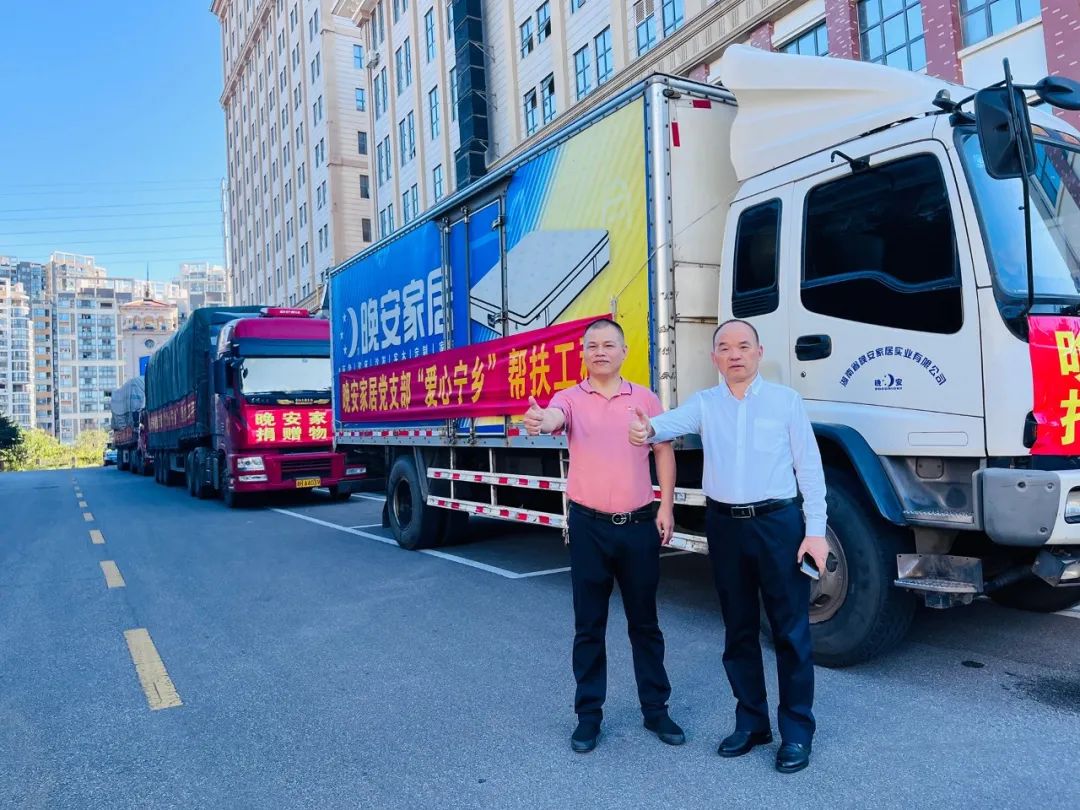 2022年月11日,一輛輛裝有實木床、床墊的大貨車從長沙晚安家居文化園開出,浩浩蕩蕩駛向?qū)庎l(xiāng)市,標(biāo)志著晚安家居黨支部助力“愛心寧鄉(xiāng)”幫扶工程捐贈物資正式到位。