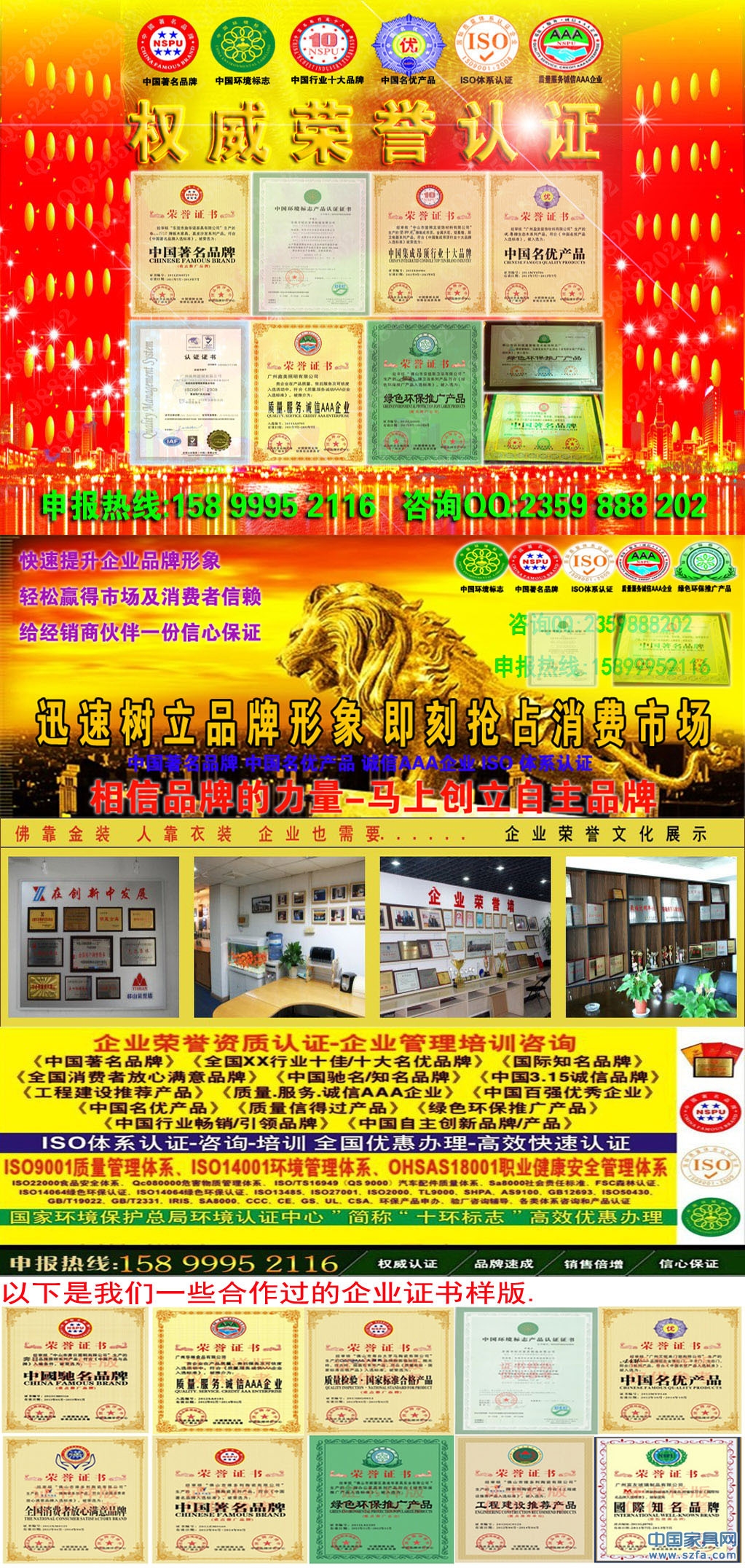 國家權(quán)威機(jī)構(gòu)認(rèn)證申辦:《中國著名品牌》《中國名優(yōu)產(chǎn)品》《質(zhì)量信得過產(chǎn)品》《全國XX行業(yè)十佳名優(yōu)品牌》《質(zhì)量.服務(wù).誠信AAA單位》《全國消費(fèi)者放心滿意品牌》《綠色環(huán)保推廣產(chǎn)品》《中國工程建設(shè)推薦產(chǎn)品》《國際知名品牌-中英版》《廣東省名牌產(chǎn)品》《廣東省著名商標(biāo)》《中國環(huán)境(十環(huán))標(biāo)志》各項ISO環(huán)境體系認(rèn)證CCC認(rèn)證等多項品牌產(chǎn)品榮譽(yù)證書申辦,海內(nèi)外商標(biāo)專利注冊及公司工商注冊,擁有龐大的服務(wù)網(wǎng)點(diǎn),高覆蓋、高效率的服務(wù)獲得多家公司和機(jī)構(gòu)的認(rèn)可。將以最專業(yè)的精神為您提供安全、經(jīng)濟(jì)、專業(yè)的服務(wù)。聯(lián)系人:15899952116黃經(jīng)辦