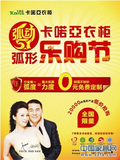 卡喏亞衣柜弧形樂購節(jié)來了!好衣柜攜手陳建斌、蔣勤勤夫婦舉辦“弧動五一”樂購盛會,讓家具弧動起來!150度弧線設計,行業(yè)唯一弧度,最潮最先進,別家都沒有!在樂購節(jié)期間,卡喏亞以最大的優(yōu)惠力度感恩全國億萬消費者!20000件弧形產(chǎn)品低價搶購,全國限量,錯過就是遺憾!還有加弧不加價,0元免費定制等震撼巨惠,不參與就遺憾!讓我們一起弧動五一,High翻整個五月!