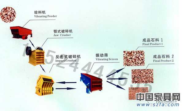 石料生產(chǎn)線的流程大致為:(料倉) ---- 給料機(jī) ---- 鄂式破碎機(jī) ---- 反擊式破碎機(jī) ---- 振動(dòng)篩 ---- (可成成品)。其中間的機(jī)器之間可用輸送機(jī)相接。詳細(xì)訪問http://www.shuiniqiumoji.com.cn