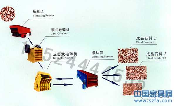 石子生產(chǎn)設備生產(chǎn)流程如下:開采的礦石先由振動給料機送料給顎式破碎機進行粗碎,在破碎至合理細度后經(jīng)由液壓圓錐進行粒度整形,之后由立式?jīng)_擊破碎機再次進行破碎,再經(jīng)由振動篩篩分出成品。其成品的粒度由破碎設備的型號和振動篩的型號決定。