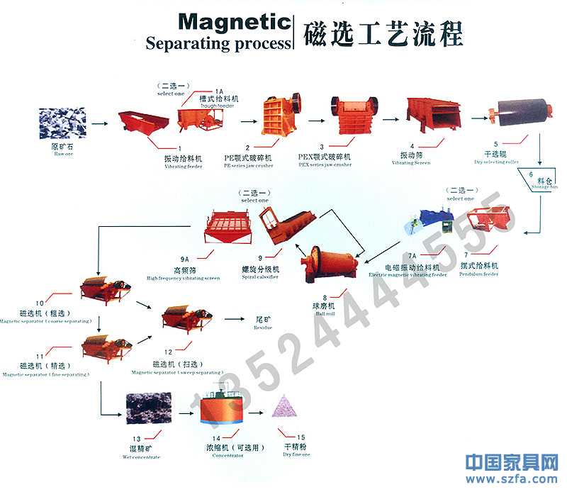 磁鐵礦選礦設(shè)備具體生產(chǎn)流程如下: 開采的礦石先由顎式破碎機(jī)進(jìn)行初步破碎,在破碎至合理細(xì)度后經(jīng)由提升機(jī)、給礦機(jī)均勻送入球磨機(jī),由球磨機(jī)對(duì)礦石進(jìn)行粉碎、研磨。經(jīng)過球磨機(jī)研磨的礦石細(xì)料進(jìn)入下一道工序—分級(jí)。螺旋分級(jí)機(jī)借助固體顆粒的比重不同而在液體中沉淀的速度不同的原理,對(duì)礦石混合物進(jìn)行洗凈和分級(jí)。經(jīng)過洗凈和分級(jí)的礦物混合料在經(jīng)過磁選機(jī)時(shí),由于各種礦物的比磁化系數(shù)不同,經(jīng)由磁力和機(jī)械力將混合料中的磁性物質(zhì)分離開來。 經(jīng)過磁選機(jī)初步分離后的礦物顆粒在被送入浮選機(jī),根據(jù)不同的礦物特性加入不同的藥物,使得所要的礦物質(zhì)與其他物質(zhì)分離開。在所要的礦物質(zhì)被分離出來后,因其含有大量水分,須經(jīng)濃縮機(jī)的初步濃縮,再經(jīng)烘干機(jī)烘干,即可得到干燥的礦物質(zhì)。