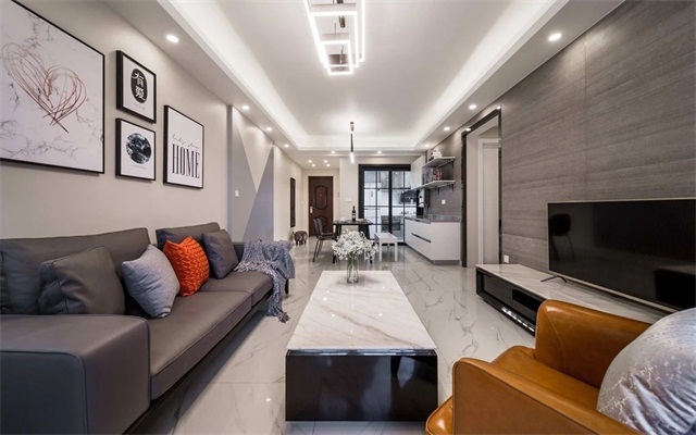 現(xiàn)代風(fēng)格以灰色為基調(diào),橙色沙發(fā)和抱枕讓整個(gè)空間看起來(lái)不那么壓抑;電視墻采用1200x600磚上墻,配合黑白烤漆電視柜,使整個(gè)客廳的空間顯得寬闊和大氣。