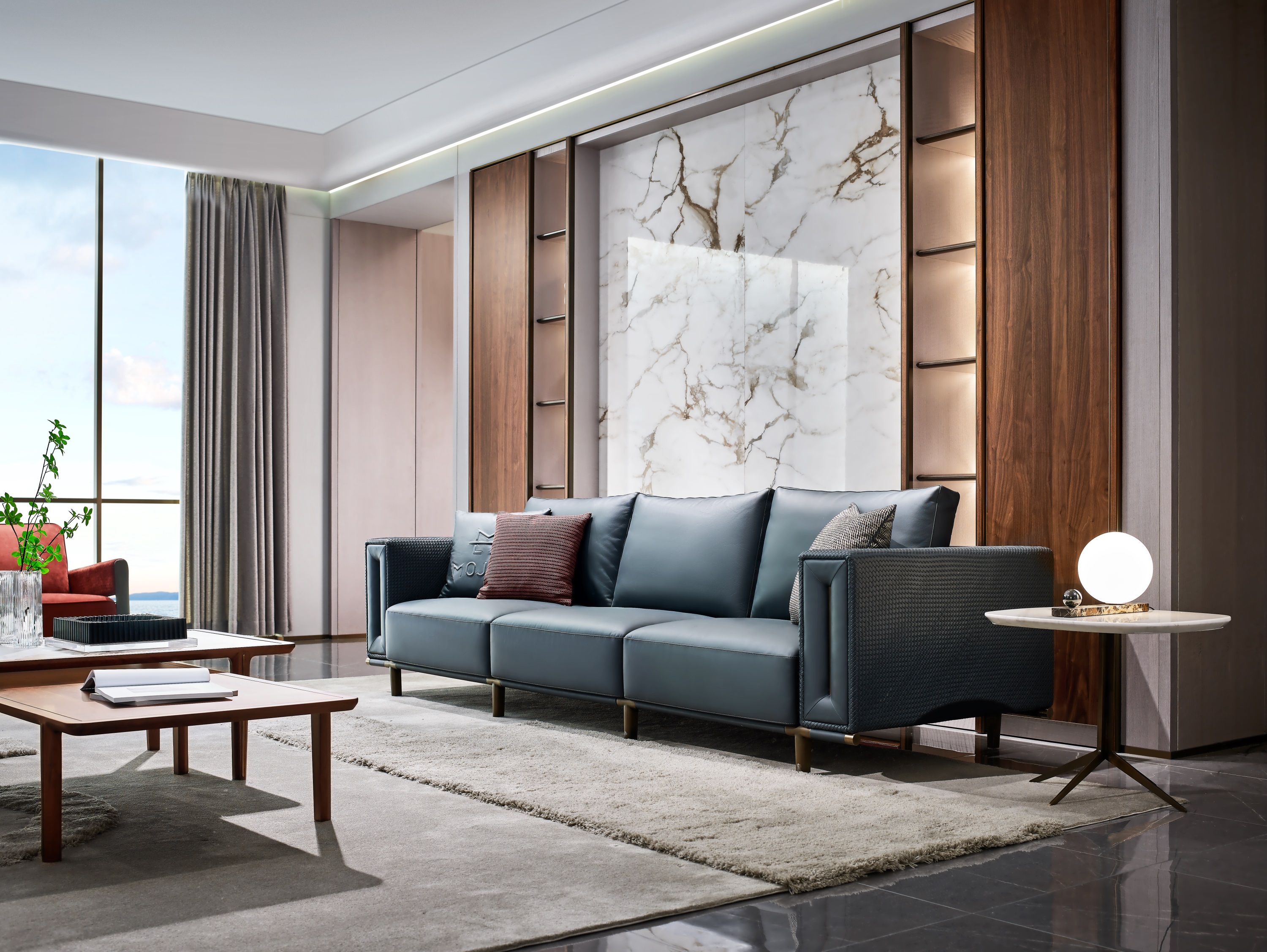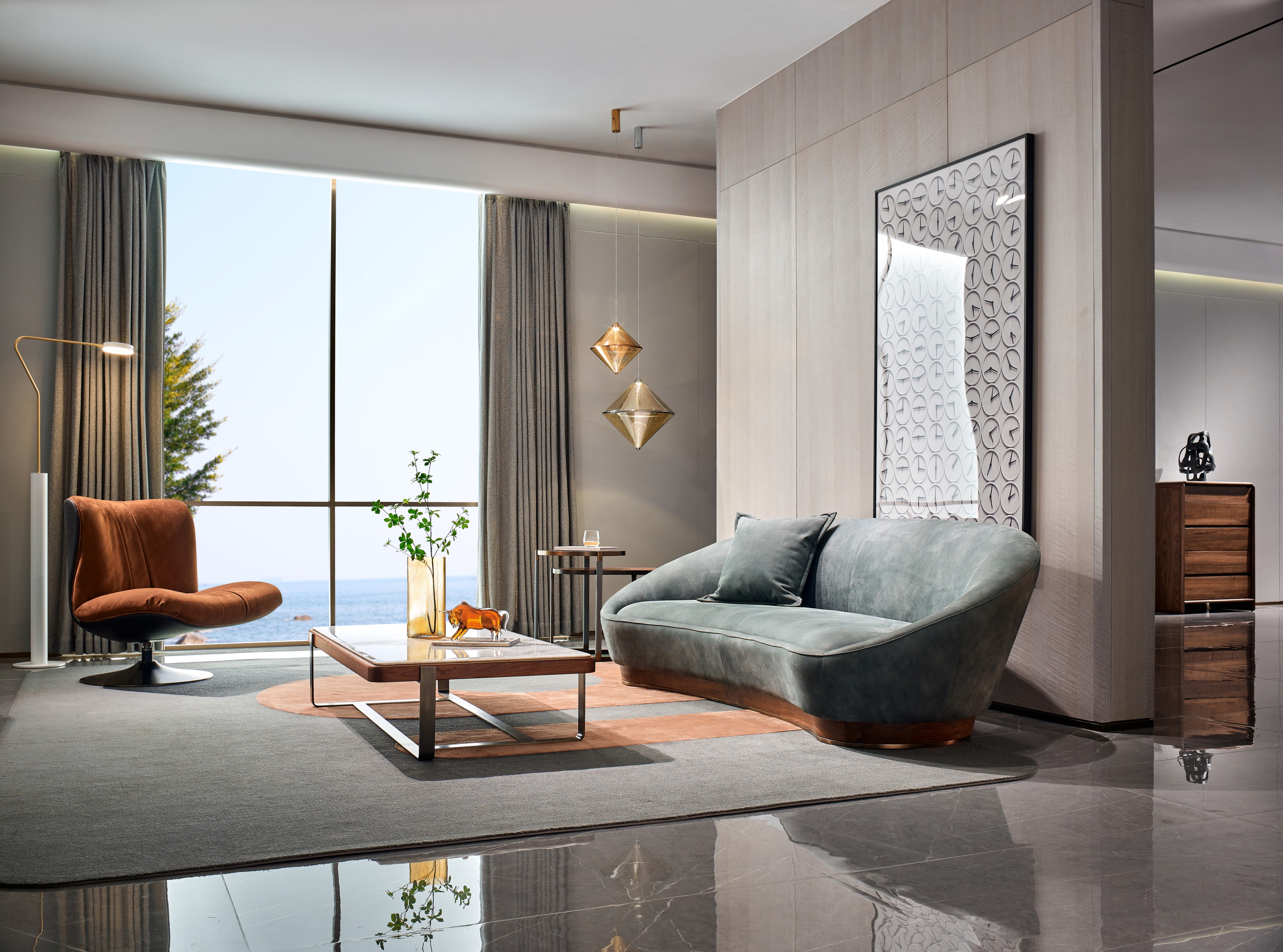 在材質(zhì)上,大膽引入新材料,將胡桃木與真皮、天然大理石、金屬、巖板、玻璃、布藝等巧妙搭配,讓產(chǎn)品在舒適之余更不失時(shí)尚氣質(zhì)。