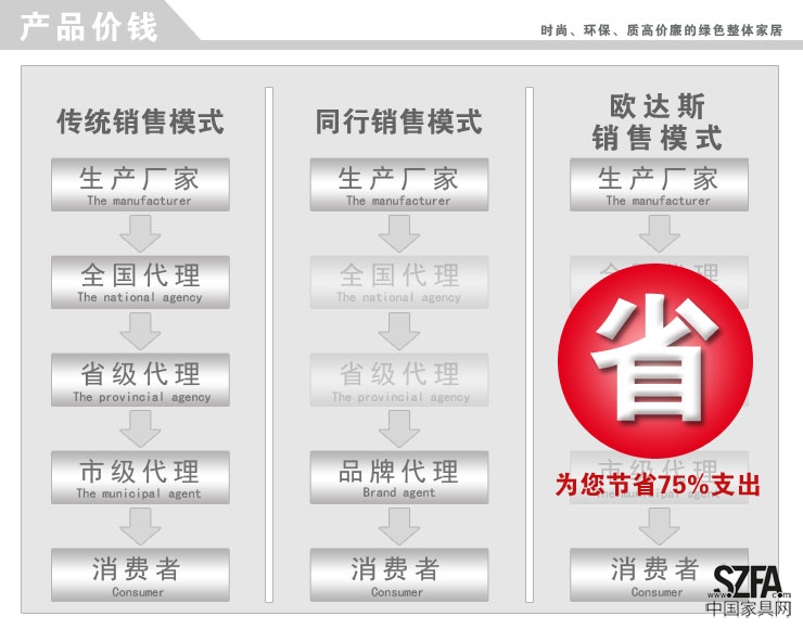 我們的家具都是由工廠直接供應(yīng),這省去了很多成本。我們用簡潔的設(shè)計和精選的材質(zhì),我們考慮每一處制造環(huán)節(jié)來確保每件家具都有很好質(zhì)量和合理的價格。品質(zhì)高一點,價格低一點,讓更多具有都市生活理念的消費者都可以享受優(yōu)家生活系統(tǒng)是我們不斷致力的目標。 銷售模式同樣執(zhí)行國際標準,所有的產(chǎn)品均配置一體化。