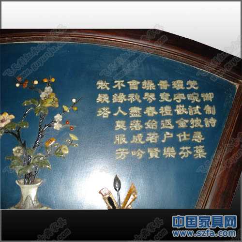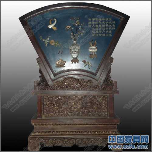 首頁 > 供應(yīng)產(chǎn)品 > 紅木嵌玉屏風(fēng):扇形屏心,以嵌玉手法飾八寶紋,是喜慶吉祥之意。