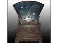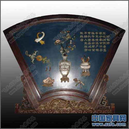 紅木嵌玉屏風(fēng):扇形屏心,以嵌玉手法飾八寶紋,是喜慶吉祥之意。