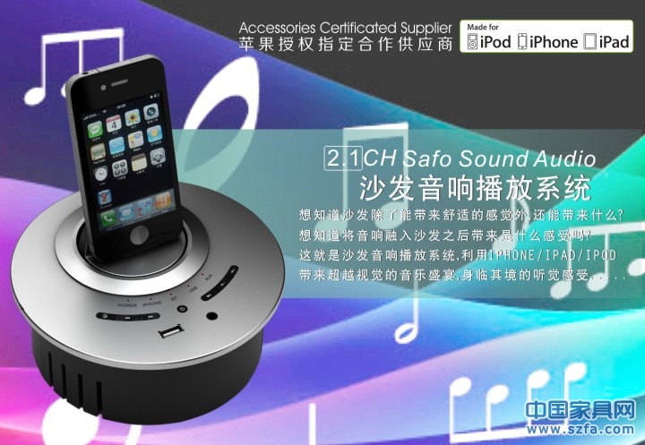 我司(佛山市順德大良威名電器有限公司)設(shè)計(jì)生產(chǎn)的2.1CH嵌入式沙發(fā)音響放器系統(tǒng),用戶可將它嵌入沙發(fā)中,安裝方便快捷,是沙發(fā)也是ipod/ipad/iphone音響,我司是直接蘋果公司授權(quán)的指定合作供應(yīng)商,內(nèi)置了直接蘋果公司授權(quán)的無線視頻解碼器功能,通過2.4G高清無線視頻輸出,讓嵌入沙發(fā)音響播放器與電視機(jī)同步演繹,視頻高清流暢,品質(zhì)卓越,音質(zhì)純正優(yōu)美。讓用戶在家也可以享受到頂級(jí)的視聽盛宴。