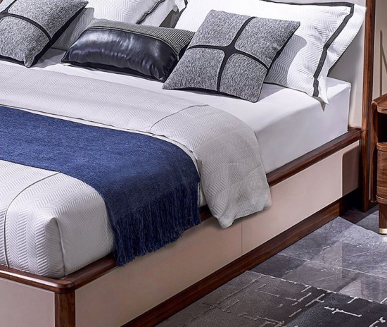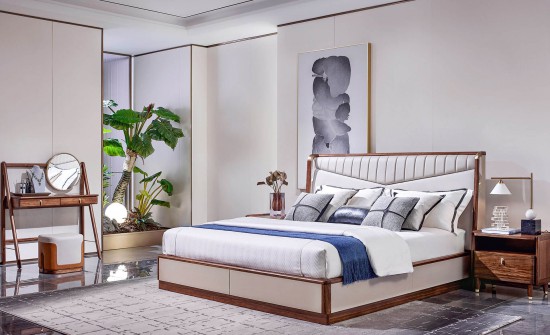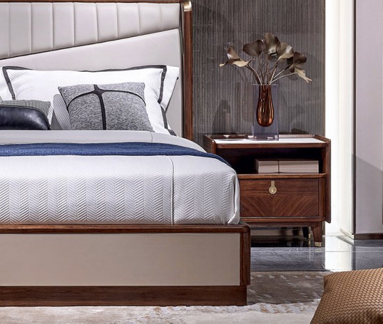 整體空間霸氣十足又不失典雅,展現寬闊坦蕩的胸懷和無拘無束的生活狀態(tài)。床身穩(wěn)重厚實,床頭落落大方,時尚與高雅不言而喻。