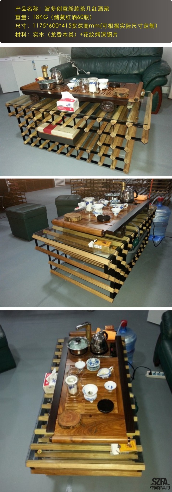 些款波多新型茶幾酒架可儲藏紅酒60瓶。