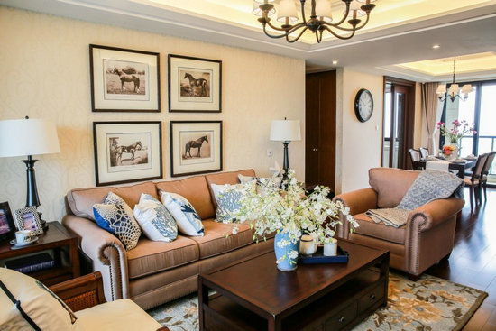 軟裝過程中,色彩搭配決定了居室整體氣質(zhì)。美式風格傾向于沉穩(wěn)的濃色,如咖啡色、深桃花芯色,來奠定優(yōu)雅基調(diào)。對中小戶型而言,設(shè)計師點綴藍、白、綠、黃、粉等活力色彩,利用靠墊、擺件、花瓶等潮流單品,中和家具基調(diào),能為中小空間帶來一份輕盈。