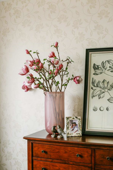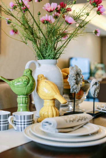 在基調(diào)沉穩(wěn)的餐廳以及臥室中,色彩鮮艷的仿真綠植及黃色、綠色小鳥擺件,緩和了美式家具的“濃妝”,為空間融入些許海洋、自然原野的風味,更添趣味性。