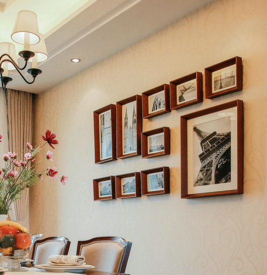 在面積不足10㎡的餐廳,設(shè)計師借助錯落式陳列方式,將3種尺寸的建筑墻畫排列組合,豐盈小空間層次又不失秩序。自由放入相片時,這里將成為一道家的風景線。