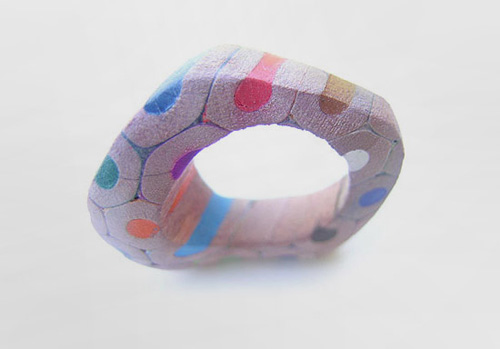 看來(lái)天真爛漫的想象力真是設(shè)計(jì)師不可缺少的創(chuàng)意源泉,如若不然,Maria Cristina Bellucci怎么會(huì)嘗試用彩色鉛筆頭做出如此讓人驚訝的首飾呢?她將鉛筆頭排列粘貼起來(lái)用不同的手法切割打磨,將色彩繽紛的鉛筆芯和質(zhì)感強(qiáng)烈的木頭裸露出來(lái),結(jié)合銀質(zhì)部件打造成每一只都獨(dú)一無(wú)二的彩鉛首飾。不知道首飾的表面有沒(méi)有涂些保護(hù)層,不然豈不是要給生活到處留色?