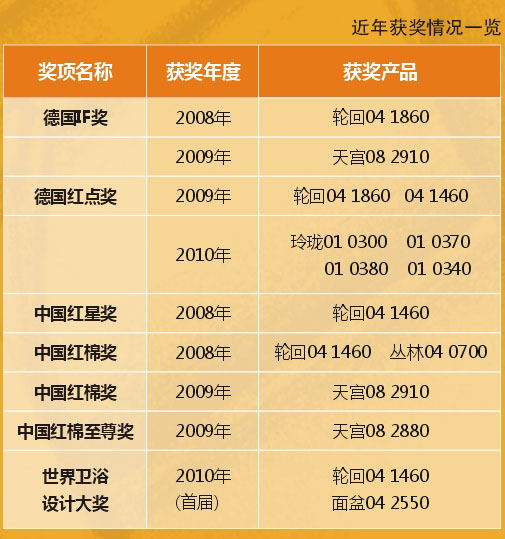 2010年3月初,安蒙衛(wèi)浴再一次成為了行業(yè)的焦點(diǎn),安蒙衛(wèi)浴“玲瓏”系列四款產(chǎn)品同時(shí)榮獲德國紅點(diǎn)大獎(jiǎng)。而這一切都出自中國的原創(chuàng)設(shè)計(jì),見證了民族品牌在世界設(shè)計(jì)領(lǐng)域的崛起,向世人昭示國內(nèi)衛(wèi)浴行業(yè)蓬勃的創(chuàng)新力量與發(fā)展遠(yuǎn)景。