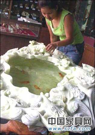 在成都送仙橋藝術(shù)城展出的一款身價(jià)16萬(wàn)元的魚(yú)缸讓人大開(kāi)眼界。該魚(yú)缸由1000公斤岫玉打造而成,工匠師傅花了足足半年時(shí)間。魚(yú)缸呈青白色,長(zhǎng)1.2米,上面鑿了14只金魚(yú),既傳統(tǒng)又不失現(xiàn)代特色。據(jù)魚(yú)缸的主人說(shuō),岫玉堪稱國(guó)玉,由此打造的魚(yú)缸極具收藏價(jià)值。
