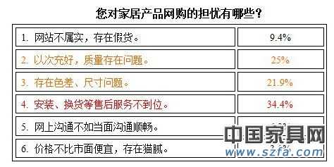 日前記者圍繞“消費(fèi)者對家居產(chǎn)品網(wǎng)購的擔(dān)憂有哪些”這一主題,就終端消費(fèi)者的投訴問題展開了一次廣泛的網(wǎng)絡(luò)調(diào)查活動(dòng)。其中,選擇“安裝、換貨等售后服務(wù)不到位”的人數(shù)占 34.4%,選擇“以次充好、質(zhì)量存在問題”的占25%,選擇“存在色差、尺寸問題”的占21.9%,這些是家居行業(yè)網(wǎng)銷存在的主要問題。除了這三大問題之外,在終端消費(fèi)市場,還存在諸如“網(wǎng)上溝通不如當(dāng)面溝通順暢”、“價(jià)格存在貓膩,不比市面便宜”、“網(wǎng)站不屬實(shí),存在假貨”等方面的問題。正是這些不利因素,促成了部分消費(fèi)者對家居網(wǎng)購認(rèn)可度不高的印象。