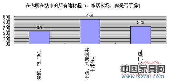 隨著家居建材以及裝飾裝修市場在近年來的不斷擴張,包括上海、杭州、南京等地在內(nèi)的華東省市更迎來一股明顯的家居賣場擴張潮。從小區(qū)門口的家具店、五金建材店,到當(dāng)?shù)乇就两ú某械臒峄?、全國大型連鎖賣場的洶涌來襲,再到跨國資金國外賣場品牌的入駐……讓人眼花繚亂的同時,消費者的選擇也越來越多。面對這一變化,消費者對自己所在城市的所有建材超市、家居賣場,究竟了解多少?截至2011年2月23日下午15點14分,共有348位網(wǎng)友參與調(diào)查,網(wǎng)友所在區(qū)域主要覆蓋上海、杭州、南京,以及江浙周邊的華東城市。從投票結(jié)果可以看出,雖然賣場擴張速度快,擴張步伐大,但是對于普通消費者而言,他們的關(guān)注范圍還比較有限。45%的網(wǎng)友表示只知道其中部分,32%的網(wǎng)友表示不怎么了解,僅23%的網(wǎng)友表示自己很了解。而在日前,搜狐記者前往紅星美凱龍滬南店實地考察時,某家具品牌門店負(fù)責(zé)人這樣告訴記者,開業(yè)以來,到店里的消費者90%是浦東當(dāng)?shù)氐?,另?0%從其他地區(qū)過來的,其中大部分也都住在浦西中環(huán)附近距離該門店車程比較方便的地方。由此不難看出,地域性對于消費者對當(dāng)?shù)亟ú某?、家居賣場的認(rèn)識起到不小的作用。
