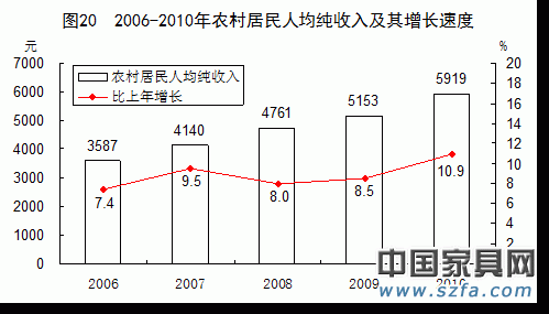 全年農(nóng)村居民人均純收入5919元,剔除價格因素,比上年實(shí)際增長10.9%;城鎮(zhèn)居民人均可支配收入19109元,實(shí)際增長7.8%。農(nóng)村居民家庭食品消費(fèi)支出占消費(fèi)總支出的比重為41.1%,城鎮(zhèn)為35.7%。按2010年農(nóng)村貧困標(biāo)準(zhǔn)1274元測算,年末農(nóng)村貧困人口為2688萬人,比上年末減少909萬人。