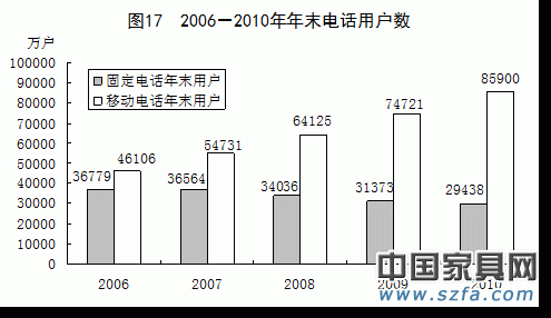 全年完成郵電業(yè)務(wù)總量[9]32940億元,比上年增長20.6%。其中,郵政業(yè)務(wù)總量1985億元,增長21.6%;電信業(yè)務(wù)總量30955億元,增長20.5%。全年局用交換機(jī)容量減少2707萬門,總?cè)萘?6559萬門;新增移動電話交換機(jī)容量[10]6433萬戶,達(dá)到150518萬戶。固定電話年末用戶29438萬戶。其中,城市電話用戶19662萬戶,農(nóng)村電話用戶9776萬戶。新增移動電話用戶11179萬戶,年末達(dá)到85900萬戶。其中,3G移動電話用戶[11]4705萬戶。年末全國固定及移動電話用戶總數(shù)達(dá)到115339萬戶,比上年末增加9244萬戶。電話普及率達(dá)到86.5部/百人?;ヂ?lián)網(wǎng)上網(wǎng)人數(shù)4.57億人,其中寬帶上網(wǎng)人數(shù)4.50億人;互聯(lián)網(wǎng)普及率達(dá)到34.3%。