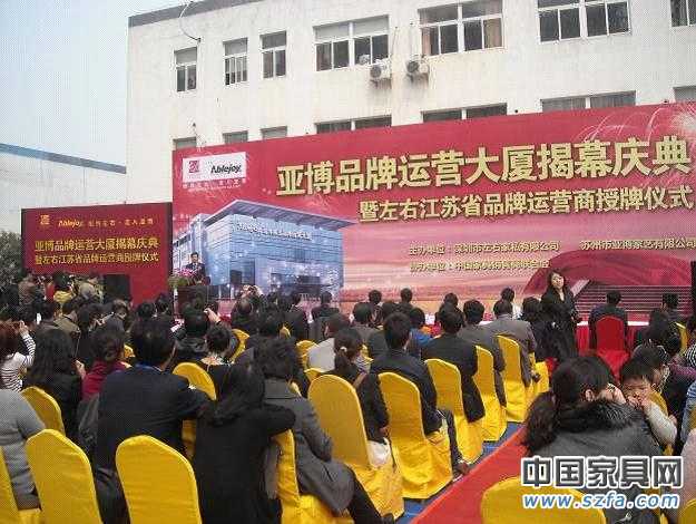 2011年4月9日,亞博·左右品牌運(yùn)營(yíng)大廈啟動(dòng)儀式暨“聚鋒裂變—中國(guó)家具前沿之運(yùn)營(yíng)道”活動(dòng)盛大開(kāi)幕,來(lái)自蘇州當(dāng)?shù)卣⒅屑覅f(xié)、深家協(xié)、廣東省商會(huì)、家商會(huì)等機(jī)構(gòu)領(lǐng)導(dǎo),以及左右家私全國(guó)各地經(jīng)銷(xiāo)商一同出席了此次行業(yè)盛會(huì)。本次盛會(huì)的召開(kāi),深入探究了中國(guó)家具行業(yè)的市場(chǎng)現(xiàn)狀,并為中國(guó)家具銷(xiāo)售模式創(chuàng)新帶來(lái)了全新思路。