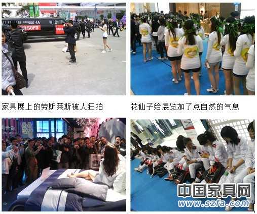 深圳做為設(shè)計(jì)之都,深圳家具展在廣告宣傳上更立體。華僑城的人體雕塑被很多家具廠搬進(jìn)家具展,還有群體舉牌巡場(chǎng),吆喝,紅衛(wèi)兵武裝發(fā)傳單,航天制服隊(duì)伍,中國(guó)古典服裝、士兵服裝……其中左右沙發(fā)把一群花仙子引進(jìn)展覽館給展覽加了點(diǎn)自然的氣息。