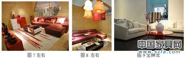 風(fēng)格上以穩(wěn)重簡約現(xiàn)代時尚為主導(dǎo),配飾環(huán)境(包括燈飾,床品,地毯等)大體分兩種風(fēng)格,一種是與軟體家具本身色調(diào)和諧的搭配,體現(xiàn)出家具與環(huán)境的和諧;如圖7與圖8左右的沙發(fā),紅色沙發(fā),配以含有紅色花紋的地攤,紅色靠枕,紅色系列餐具、柜子、燈飾,整體感強烈。另一種是與軟體家具本身色調(diào)形成鮮明對比的搭配方式,此類搭配,多數(shù)是黑白米色家具配以鮮明色彩的配飾,或者閃光的亮片類的布藝,以此在家具色彩單調(diào)的基礎(chǔ)上,構(gòu)建色彩空間,如堡獅龍白色沙發(fā)配上紅色茶幾,讓空間感覺不再單調(diào)。