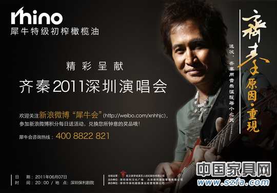 據(jù)了解,至6月7日,凡在全國(guó)各地指定賣場(chǎng)購(gòu)買犀牛特級(jí)初榨橄欖油滿600元的消費(fèi)者即可獲贈(zèng)齊秦2011深圳演唱會(huì)門票一張。其中,購(gòu)買犀牛特級(jí)初榨橄欖油滿3800元的消費(fèi)者,更可獲贈(zèng)價(jià)值2580元門票1張。與此同時(shí),凡是犀牛會(huì)會(huì)員積分滿6000積分,也可獲贈(zèng)價(jià)值380元門票1張。而在6月7日前加“犀牛會(huì)”新浪微博成為粉絲的消費(fèi)者,同樣有機(jī)會(huì)獲贈(zèng)演唱會(huì)門票和齊秦的簽名CD。