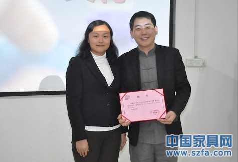 中國(guó)家具產(chǎn)業(yè)教育學(xué)院客座講師的授牌儀式上,中國(guó)家具產(chǎn)業(yè)教育學(xué)院策劃總監(jiān)董媛媛小姐與符凱老師合照