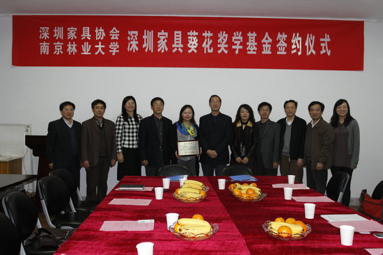 2011年11月18日,深圳市家具行業(yè)協(xié)會(huì)、深圳家具研究開發(fā)院、中國(guó)家具產(chǎn)業(yè)教育學(xué)院賴珍珍院長(zhǎng)出席了在南京林業(yè)大學(xué)家具與工業(yè)設(shè)計(jì)學(xué)院舉行的“深圳家具行業(yè)協(xié)會(huì)、南京林業(yè)大學(xué)‘深圳家具葵花獎(jiǎng)學(xué)基金’簽約儀式”。南京林業(yè)大學(xué)副校長(zhǎng)趙林教授、教育發(fā)展基金會(huì)理事長(zhǎng)陳景歡教授及南林相關(guān)職能部門的單位負(fù)責(zé)人和學(xué)生代表出席了簽約儀式。捐贈(zèng)儀式由南京林業(yè)大學(xué)家具與工業(yè)設(shè)計(jì)學(xué)院院長(zhǎng)吳智慧教授主持,賴珍珍女士和吳智慧教授分別代深圳家協(xié)、南京林業(yè)大學(xué)在捐贈(zèng)協(xié)議上簽字。