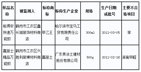 結(jié)果顯示,標(biāo)稱哈爾濱市寶馬工貿(mào)有限責(zé)任公司生產(chǎn)的“甲乙王” 粘得牢快速萬能膠(300ml 2011-03-05)檢出苯項(xiàng)目不合格,標(biāo)稱廣東美涂士建材股份有限公司生產(chǎn)的嘉麗士精品萬能膠(500g 2011-02-16)檢出游離甲醛項(xiàng)目不合格。據(jù)了解,苯、游離甲醛,在生產(chǎn)和施工過程中會(huì)揮發(fā)出來,危害到生產(chǎn)者和施工者的身體健康。