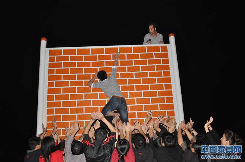 游戲規(guī)則:全隊所有成員在規(guī)定的時間內(nèi)翻越一面高4.2米的光滑墻面,在此過程中,所能用的資源只有每個人的身體,不能借助任何外界的工具。