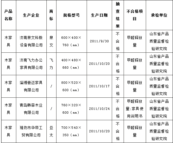 抽查發(fā)現(xiàn)5批次產(chǎn)品甲醛釋放量項目不合格,涉及濟南泉文科教設備有限公司、濟南飛力辦公家具有限公司、淄博豪邁家具有限公司、青島韓森木業(yè)有限公司、濰坊市華帝工貿(mào)有限公司等5家企業(yè)。個別產(chǎn)品還檢出家具使用說明書項目不合格。