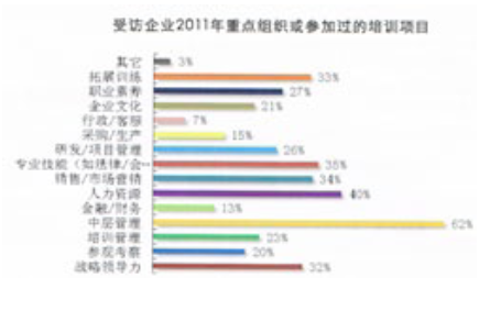 2011年有62%的企業(yè)重點(diǎn)組織過“中層管理”的培訓(xùn)項(xiàng)目,這與中層管理者是企業(yè)培訓(xùn)預(yù)算最多的群體保持一致。此外,“銷售、人力資源、戰(zhàn)略領(lǐng)導(dǎo)力、專業(yè)技能、拓展訓(xùn)練”的培訓(xùn)項(xiàng)目也成為2011年企業(yè)的重點(diǎn)培訓(xùn)項(xiàng)目。