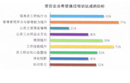 企業(yè)希望通過培訓(xùn)達(dá)成的目標(biāo)整體以學(xué)員的能力提高和績效提升為核心,也有43%的企業(yè)希望通過培訓(xùn)讓員工認(rèn)同企業(yè)的文化,有21%的企業(yè)將培訓(xùn)定義為員工福利。