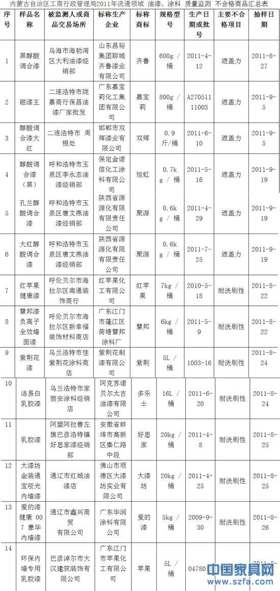 其中,由阿克蘇諾貝爾太古油漆有限公司2011年6月20日生產(chǎn)的一款規(guī)格型號為16L/桶的多樂士牌潔易白乳膠漆耐洗刷性不合格;由廣東嘉寶莉化工集團有限公司生產(chǎn)的批號為A27051111003的規(guī)格型號為800g/桶的嘉寶莉磁漆王遮蓋力不合格;由紫荊花制漆有限公司生產(chǎn)的批號為1003-16的紫荊花漆耐洗刷性不合格。
