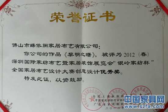 隨著2012(春)深圳國際家紡布藝暨家居裝飾展覽會圓滿落幕,在被譽為創(chuàng)意之都的深圳,全國家居布藝創(chuàng)意設計大賽的獲獎結果也新鮮出爐,其中蝶依斕家居布藝的參賽作品“黎明之曙”與“金色麥浪”榮獲全國家居布藝設計大賽創(chuàng)意設計優(yōu)秀獎。